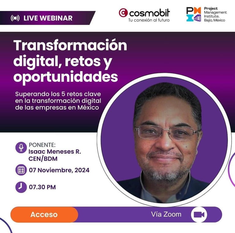 El pasado 7 de noviembre de 2024, Cosmobit tuvo el honor de presentar un webinar para los asociados de PMI Bajío, donde se abordó el tema crucial de la Transformación Digital.
